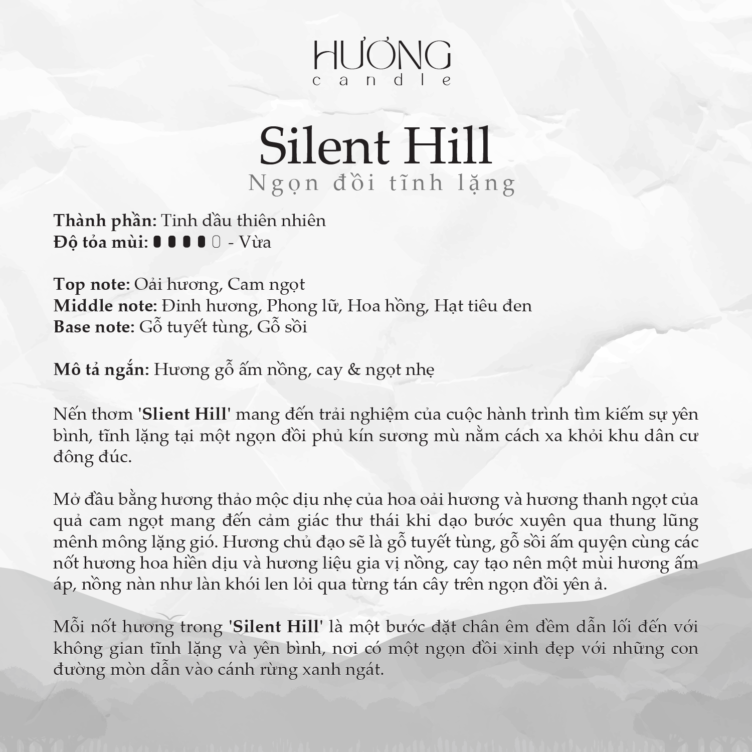 Mỗi nốt hương trong ‘Silent Hill’ là một bước đặt chân êm đềm dẫn lối đến với không gian tĩnh lặng và yên bình, nơi có một ngọn đồi xinh đẹp với những con đường mòn dẫn vào cánh rừng xanh ngát.