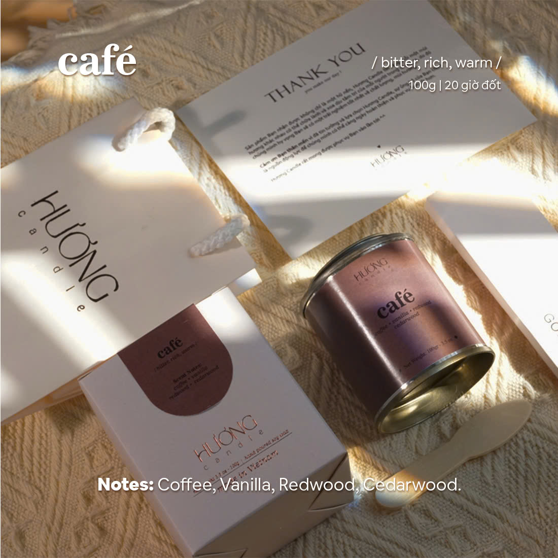 Không rộn rã với nhiều tầng hương, Café có nốt hương chủ đạo là cà phê sẽ tạo nên một không gian ấm cúng và mùi hơi đắng nhẹ của hương cà phê thổi một làn gió mới vào căn phòng của bạn.