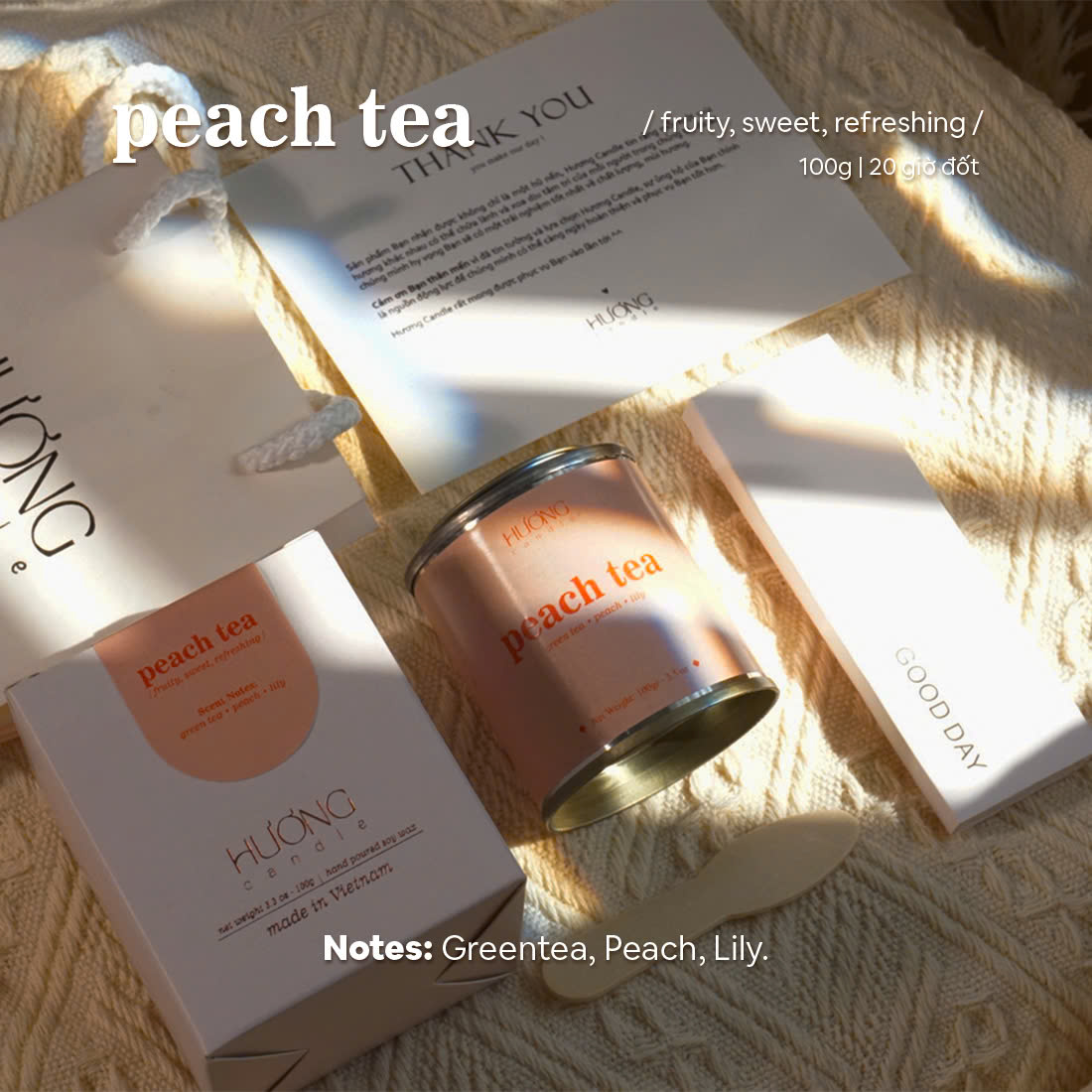Nến thơm Peach Tea là một mùi hương đầy tươi mát và ngọt ngào khi được kết hợp bởi hai mảnh ghép là hương lá trà xanh và quả đào tươi chín mọ...ng, Peach Tea sẽ mang đến cho bạn một cảm giác dễ chịu và sảng khoái như vừa thưởng thức một cốc trà đào mát lạnh giữa ngày hè nóng bức.