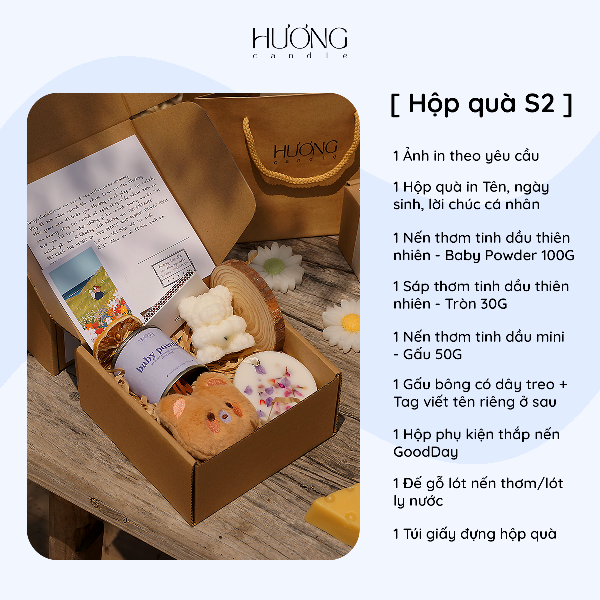 Set quà tặng cá nhân hóa IN TÊN RIÊNG, NGÀY SINH, LỜI CHÚC & IN ẢNH THEO YÊU CẦU dành riêng cho người nhận. Bộ quà tặng bao gồm đa dạng các sả...n phẩm như: Nến thơm, Sáp thơm, Chai xịt thơm vải, Xà phòng hữu cơ, Bộ tinh dầu khuếch tán, Phụ kiện nến thơm, Móc khóa gấu bông có tag viết tên riêng…